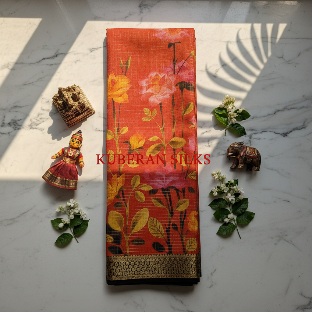 Vibrant orange Mysore silk saree featuring beautiful multicolor floral prints including lotus and leaf motifs throughout the body. This luxurious saree showcases premium silk fabric with an exquisite gold zari border featuring intricate geometric patterns.