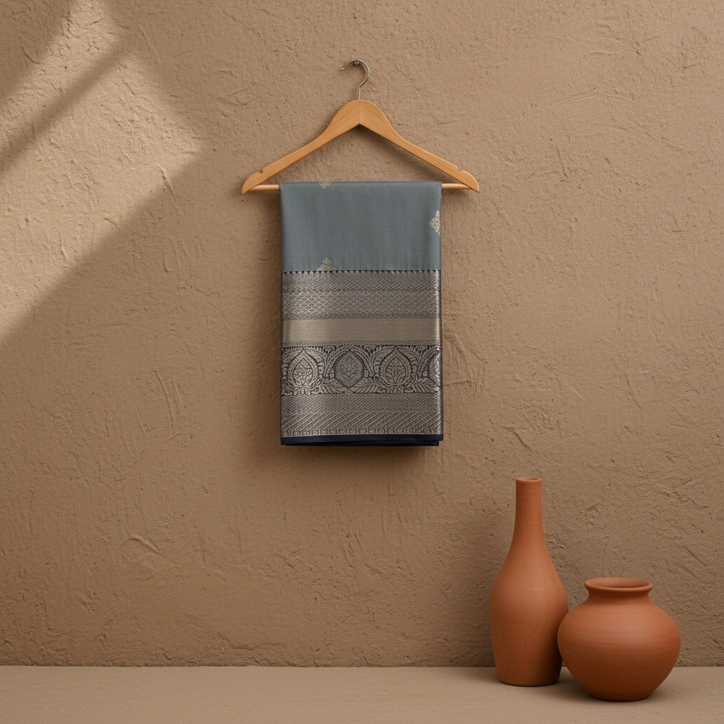 This saree exudes refined sophistication and grace, making it perfect for those who appreciate understated elegance. The serene grey paired with the luminous silver zari border creates a sophisticated, contemporary look that celebrates India's rich textile heritage with timeless appeal.