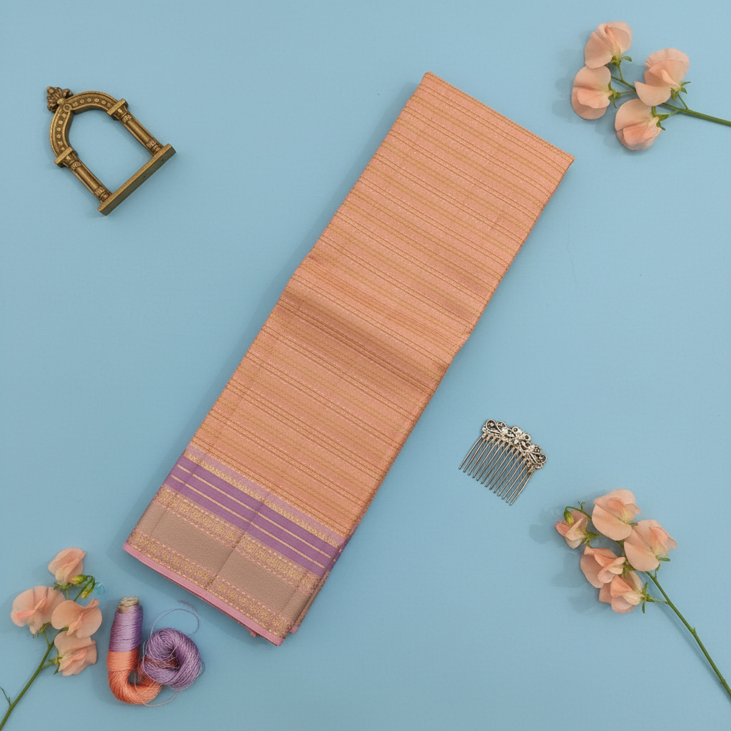 - Body: Soft peach blush with all-over self-colour gold zari fine horizontal rope-twist stripe weave