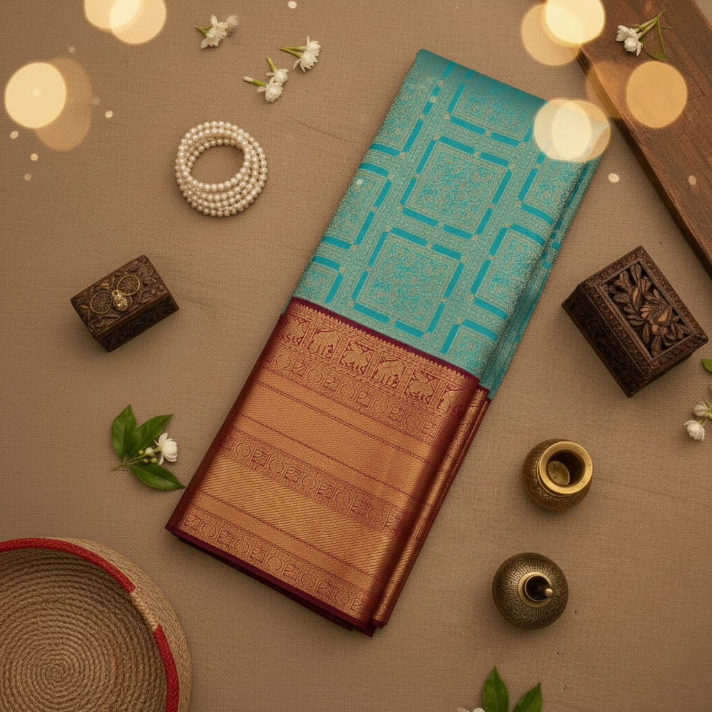 2. How do I clean my Kanchipuram silk saree? Always dry clean your Kanchipuram silk saree to preserve the silk quality and gold zari work. Avoid washing at home as water and detergents can damage the delicate silk fibers and tarnish the zari. If you notice minor stains, gently blot (don't rub) with a soft, dry cloth and take it to a professional dry cleaner experienced with silk sarees.